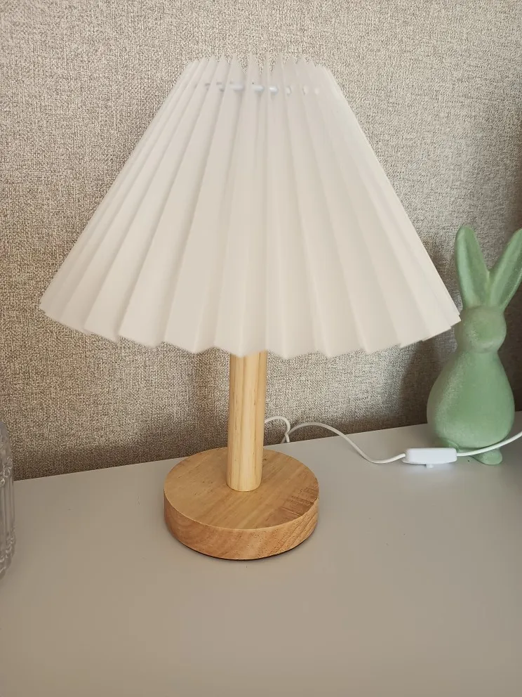 Elevate your space with this uniquely designed table lamp. Its fabric shade, reminiscent of delicate pleats, casts a soft, diffused glow perfect for creating a cozy atmosphere in any room. The wood-finish base adds a touch of natural warmth, aligning with a calm, Scandinavian-inspired aesthetic. It's an ideal accent for bedrooms, bedside tables, or any corner needing a gentle illumination and a touch of artistic flair. Dimmable and featuring a warm LED bulb, it offers adjustable brightness to suit your mood.